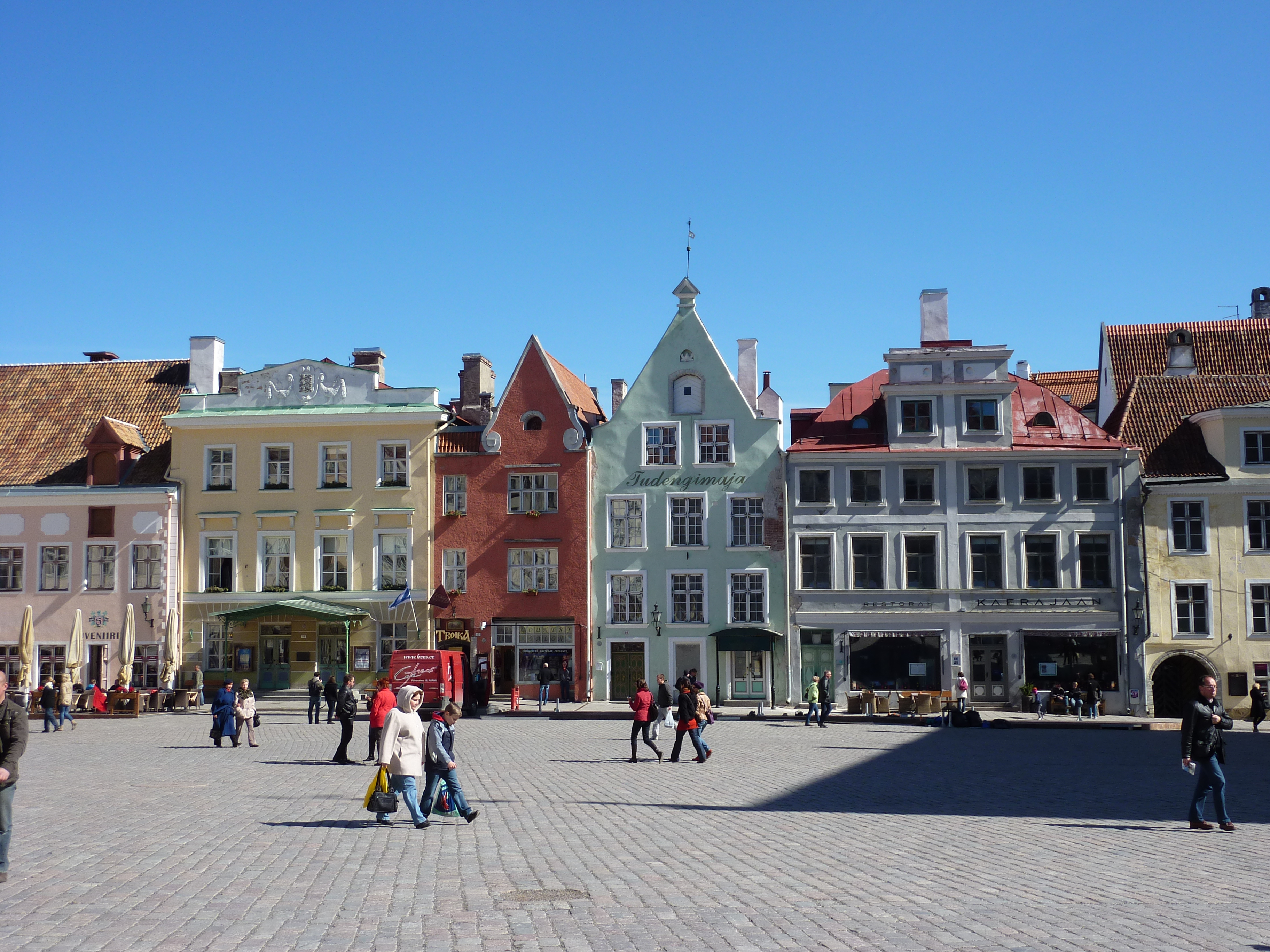 Pastel colored buildings in the Old City line the main square of Tallinn.