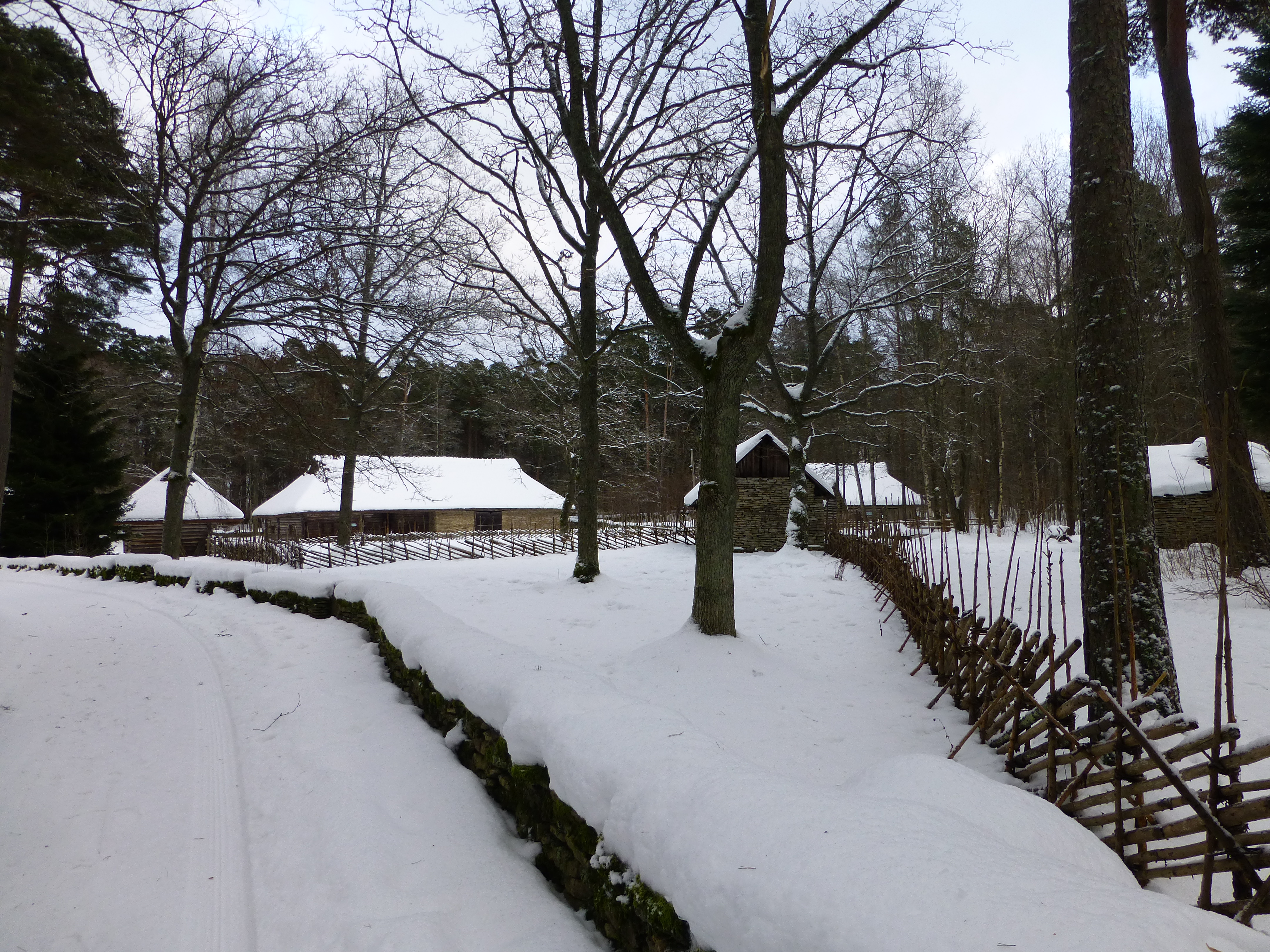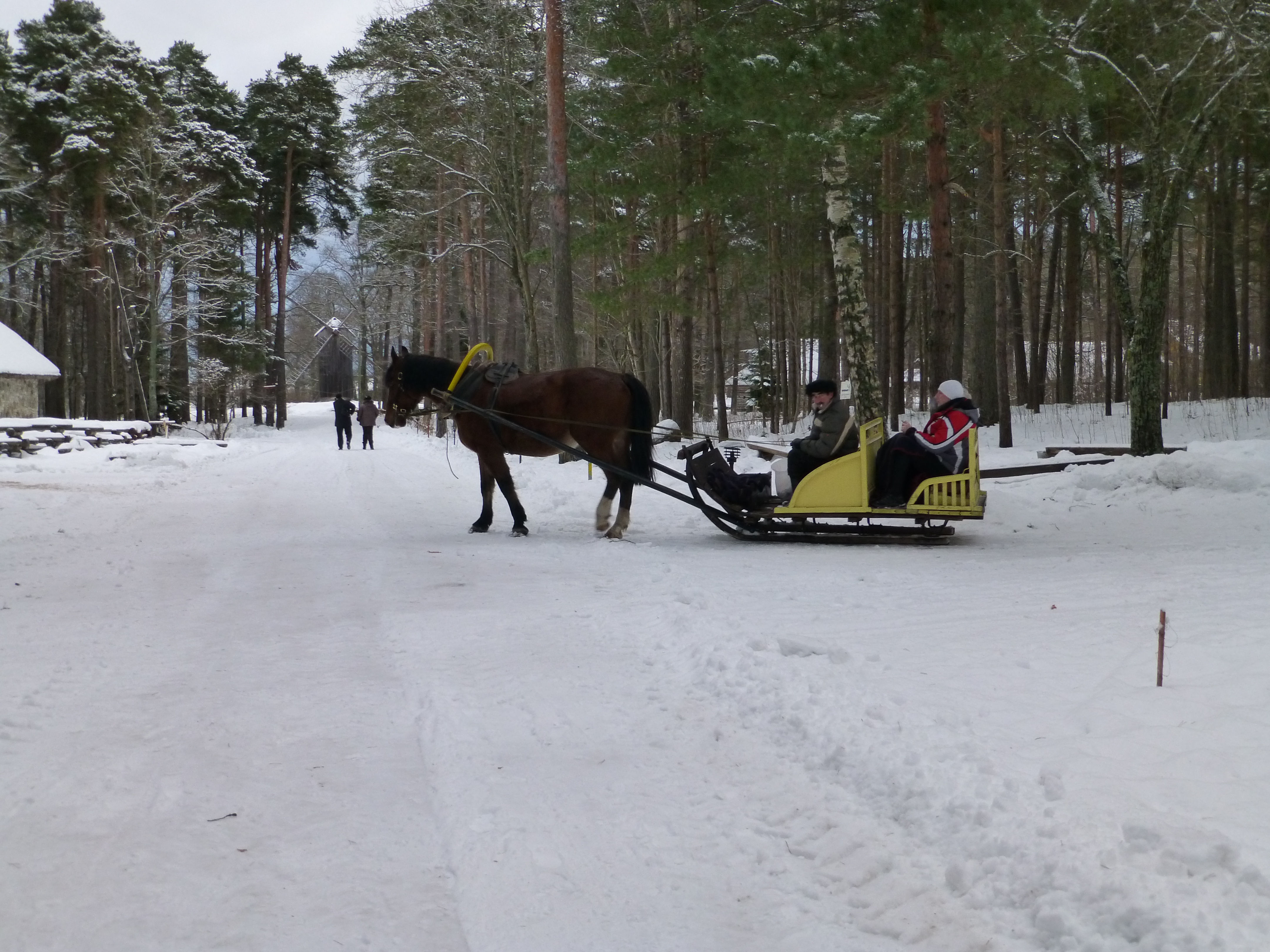 This museum village is set on a high forested-bank on Kopli Bay. At an area near the water, a small fishing village is located. Here one can get nice views of Tallinn with its high church spires that can be seen in the distance across the bay. In the summertime all the buildings are open and there are a lot of events going on that one can find out about on the internet.  In the winter, only a small handful of the buildings are open, but to see it all snow-covered is special in its own way.  We very much enjoyed our day there. At lunchtime we had hot, spiced wine and a nice meal at the tavern that is open year round. On the way out, we found out we could have taken a sleigh ride at some point during our day, but it was getting too P1020310late now to do so.  As dusk began to set in, we made our way back to the Metropol hotel at the Rotterdam Quartel to pick up our bags and made it to the bus station just in time for our 2.5-hour ride back to Tartu.